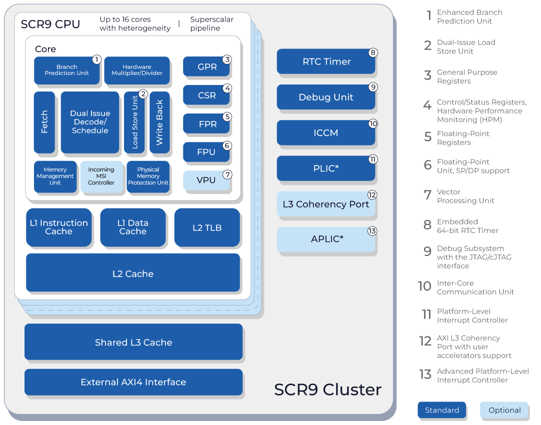 The SCR9 platform includes an out-of-order superscalar dual-issue 12-stage pipeline, a high-performance double-issue floating-point unit, PLIC or APLIC units for an advanced interrupt processing, and industry-standard AXI4 and JTAG interfaces increasing flexibility and compatibility. SCR9 includes an enhanced data prefetcher, optimized L1 and L2 caches, and an L3 network-on-chip cache with capacity up to 16MB. A hardware hypervisor, vector operations and heterogeneity support enable the design of multi-cluster architectures capable of running AOSP and Linux operating systems. The SCR9 core can operate in heterogenous multicore (up to 16 cores in a cluster) environments, offering hardware-level support for memory coherency and simplified external accelerators' integration.